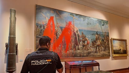 Dos activistas de Futuro Vegetal lanzan pintura a un cuadro de Colón en el Museo Naval de Madrid