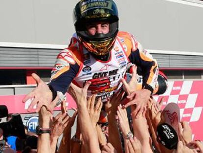 El piloto de Honda vence por primera vez en Motegi y gana su tercer título en cuatro años merced a las caídas de Rossi y Lorenzo