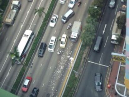 La apertura accidental de la puerta de un furgón blindado esparce fajos de billetes por la calle