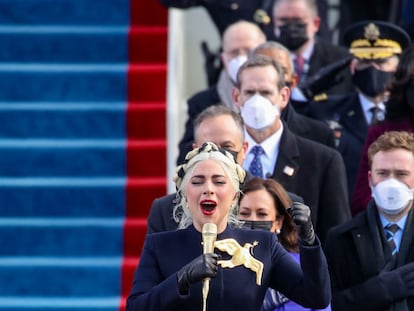 Lady Gaga fue la encargada de cantar el himno nacional en la investidura de Joe Biden. Para este momento histórico, apostó por una creación de Schiaparelli, que tiene al frente al creador estadounidense Daniel Roseberry. «Es una carta de amor al país que tanto echo de menos», ha dicho el diseñador.