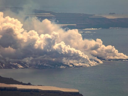 Las nubes tóxicas que genera la colada al contactar con el agua suponen la gran preocupación de las autoridades, que han fijado un perímetro de exclusión. El magma crea una pirámide en el océano de unos 50 metros