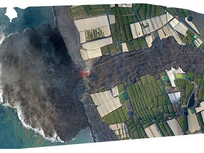La colada ha avanzado sobre el agua formando un delta de más de medio kilómetro de ancho