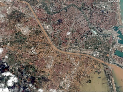 Las fotos de Landsat 8 permiten ver el reguero de destrucción que causaron los desbordamientos de la rambla del Poyo y del río Júcar