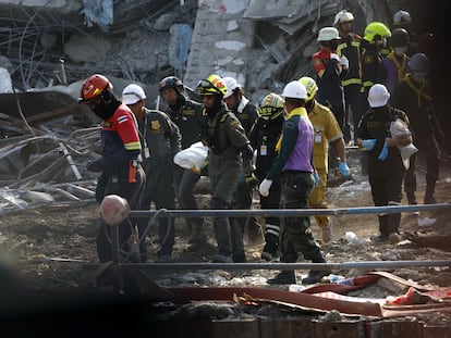 Servicios de rescate de otros países ayudan en Myanmar en las labores de recuperación de desaparecidos tras el terremoto, que ha dejado más de 1.600 muertos y 3.400 heridos en territorio birmano