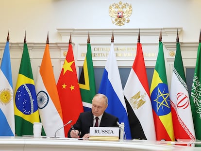 El presidente ruso, inmerso en su propia guerra contra Ucrania, afirma en una reunión de los BRICS que su posición es “coherente”. El Kremlin exige a Argentina que clarifique su adhesión al grupo tras la victoria de Milei
