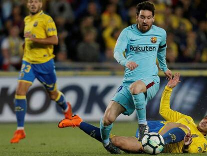 Los azulgrana conceden un empate en Las Palmas en un partido protagonizado por el árbitro y su ventaja se reduce a cinco puntos en vigilias de la visita del Atlético