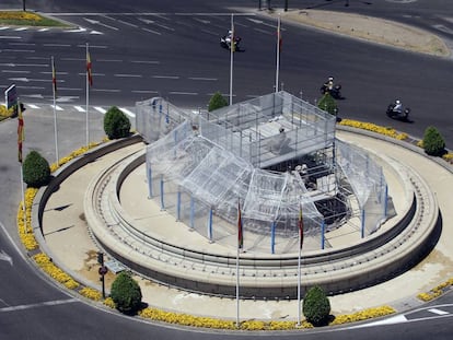 Un innovador andamio, en forma de carpa de circo, cubre a la diosa madrileña, que recibe un tratamiento de conservación preventiva