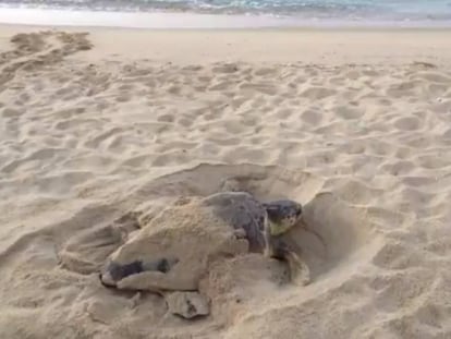 Un vídeo muestra los primeros pasos de las crías de una tortuga que desovó en el litoral barcelonés el pasado junio, un fenómeno poco frecuente en la costa mediterránea española