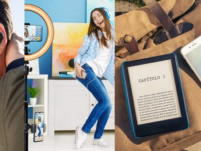 Rebajas en productos de diversas categorías, como un aro de luz para selfie, unos audífonos inalámbricos, un Kindle y una pantalla de televisión