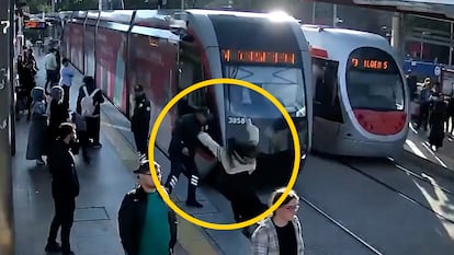 Así evita un guardia de seguridad el atropello de una mujer por un tranvía en Turquía