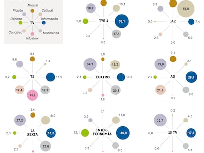 Porcentaje de tiempo emitido por las cadenas de diferentes géneros de programas.