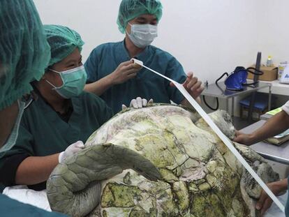 La tortuga Omsin es intervenida quirúrgicamente en la Facultad Veterinaria de la Universidad Chulalongkorn de Bangkok (Tailandia) por haber digerido 1.000 monedas de la fortuna
