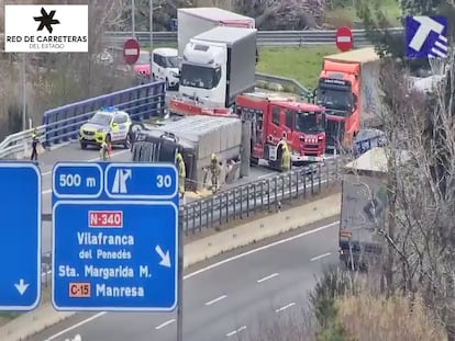 Colas kilométricas en el AP-7 a la altura de Vilafranca por el accidente de un camión cargado de cerdos