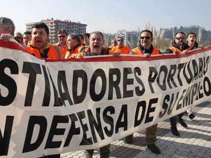 Los trabajadores que cargan y descargan en los puertos de España protestan porque con la nueva ley, las empresas no les garantizan sus condiciones laborales