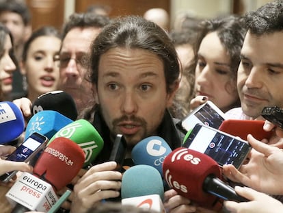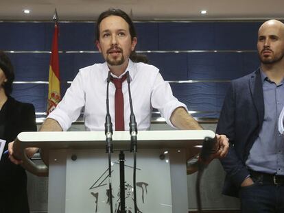 El líder de Podem llança atacs a Sánchez, Rajoy i Rivera. “Tenen tacat el seu passat en calç viva”, diu als socialistes
