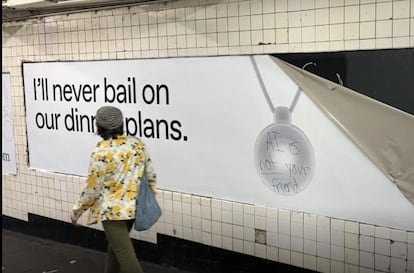 Leo que en el metro de Nueva York se está librando una batalla en la sombra. Los usuarios se han rebelado ante la avalancha de anuncios en vagones y estaciones de un producto que ha invadido la red de transporte. Se trata de la publicidad de Friend, un colgante portátil con IA que, por 129 dólares, escuchará tus conversaciones y se convertirá, dice, en tu amigo. Los anuncios, con texto negro sobre fondo blanco y, a veces, acompañados de un primer plano del colgante, se burlan de las relaciones humanas e incluyen mensajes como: “Nunca cancelaré nuestros planes para cenar”, “me tragaré esa serie entera contigo” o “jamás dejaré los platos sucios en el fregadero”.