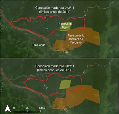 En un momento en el que la RDC se prepara para recibir estos y otros fondos, unos documentos oficiales examinados por Planeta Futuro/EL PAÍS ponen de manifiesto los planes para abrir carreteras de evacuación de madera en el bosque de Ngazi, un corredor de vida salvaje que el propio Gobierno de la RDC calificó como parte integrante de la Reserva del Hombre y la Biosfera de la UNESCO en Yangambi. Los datos geográficos también muestran cómo el Ministerio de Medio Ambiente congoleño autorizó a desplazar los límites de la concesión maderera, a pesar de la moratoria sobre nuevas operaciones de tala industrial en vigor desde hace dos décadas.