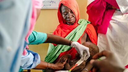 Mamadou se queda mirando cuando la enfermera dice su nombre y trata de llamar su atención. No sonríe, no llora. “¡Mamadou!”, le repite en voz alta, y el niño, de dos años, solo logra colocar la mano en el escote de su madre y entrecerrar los ojos. Llegó hace una semana al hospital de Selibaby, una ciudad de unos 26.000 habitantes al sur de Mauritania. Tenía diarrea y vómitos. Sus pequeños pies todavía se ven algo hinchados por el edema que sufría, y esa fue la señal que alertó a su madre para acudir al médico. Está ingresado junto a otros 36 menores de cinco años en una unidad especial –dos salas con camillas y poca luz, un despacho, una cocina y dos letrinas– para tratar los casos más graves de desnutrición.