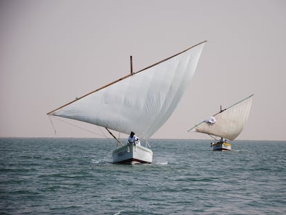 El capitán El Bar Rekon, veterano marino, se levanta temprano y atraviesa los pasillos de arena entre un puñado de precarias casetas de madera rumbo a su barca. Tras preparar los aparejos y revisar que todo está en orden, se hace a la mar. “Arriba, arriba”, le pide a su ayudante en un nítido español mientras despliega la vela que se infla con el “vienti”, como dice Rekon. “Orza, timón, macho arriba, macho abajo”: casi todas sus expresiones marineras proceden del castellano, igual que “galleta”, “agua” o “faluga”, que viene del término falúa. La huella de los pescadores canarios que faenaron durante siglos en esta zona se deja sentir a cada paso. Los pájaros revolotean junto a la barca y solo se escucha el sonido de la quilla y el suave crujido de la madera.