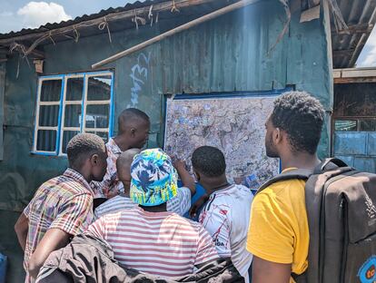 En Korogocho nadie se puede quedar en casa durante el día por el calor. La chapa con la que están hechos los mabati, como se conoce a estas casas precarias, y el pequeño tamaño (tres por tres metros) lo hacen imposible. Unos metros más allá, Margaret Waweru y Lilian Katunge se sientan con sus hijos en el poco más de medio metro de sombra que ofrece el techo de la primera. “Vamos persiguiendo la sombra durante el día”, dicen.