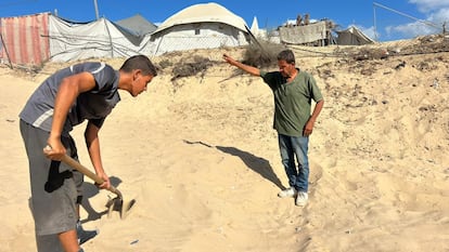 “No se sorprendan si las personas de Gaza les repiten que la muerte es una salvación”, asegura, sentado en la arena bajo el incesante sol de mediodía, Hamada Abu Hassan, mientras vuelve sus ojos vacíos de vida hacia las voces de sus hijos, Salama, de 18 años, y Anas, de 15, y les da instrucciones sobre cómo cavar en una duna del sur de la Franja.