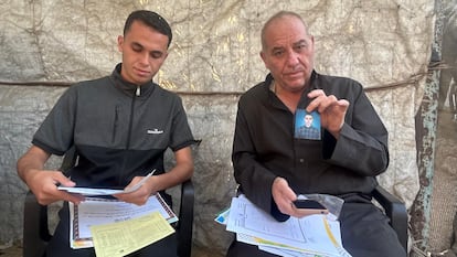 La familia lleva desplazada desde Shujaiya, al este de ciudad de Gaza, desde el segundo mes de la guerra que cumple ahora dos años, cuando su edificio de cuatro plantas fue destruido. “El sufrimiento y las penurias del desplazamiento no equivalen ni a una fracción a la amargura que siento por haber perdido a mis tres hijos”, asegura. El padre aparta la cara y rompe a llorar, consolado apenas por las palabras de su esposa Fathiya, que intenta calmarlo con refranes populares y versículos del Corán sobre la paciencia y la resistencia.