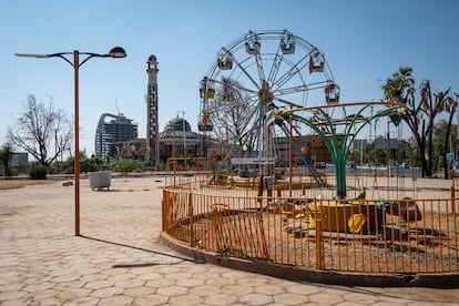Mohamed, de 14 años, barre el camino de lo que en su día fue un pequeño parque de atracciones en Jartum. “Es la columna vertebral de alguien”, dice, señalando un trozo de hueso que encontró esta mañana de finales de octubre cerca de la noria acribillada a balazos. “Era de un miembro de la milicia [las Fuerzas de Apoyo Rápido], que disparaba desde aquí contra el ejército del Gobierno. Me alegro de que haya muerto”, dice.