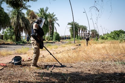 A solo una manzana del parque de atracciones, frente a una torre carbonizada que en su día albergó el Hotel Hilton, cuatro hombres se arrodillan en un campo cubierto de maleza. En sus chalecos antibalas se puede leer que forman parte de UNMAS, la agencia de Naciones Unidas encargada de limpiar minas en antiguas zonas de conflicto. Pinchan cuidadosamente el suelo con un palo de metal: así buscan minas antitanque y antipersonales que las RSF dejaron en este campo. La mayoría de las minas terrestres se encuentran enterradas a unos cinco centímetros de profundidad en el suelo.