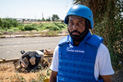 Los expertos en explosivos descubrieron “por las malas” que todavía había minas en esta zona, dice el oficial de UNMAS Mohamed Awad. “Dos soldados del Gobierno que no sospechaban nada pisaron una mina aquí recientemente y murieron en el acto”. Awad lleva un chaleco antibalas azul de la ONU. Explica que Hilton Road solía estar justo en medio de la línea del frente. “Más adelante hay un puente que conduce a una de las principales bases del Gobierno”, dice. “Para detener un avance repentino, las RSF colocaron cientos de minas a lo largo de la costa del río Nilo”. Hasta ahora, la UNMAS ha despejado 6.000 minas y municiones sin explotar solo en Jartum. Entre ellas, había 890 municiones de gran tamaño, 37 proyectiles, 26 cohetes, 15 morteros, 14 granadas y dos minas antitanques.