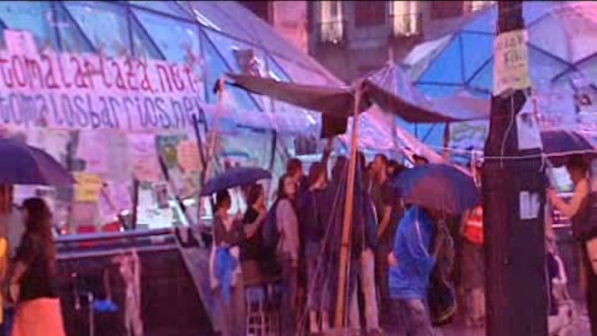 La lluvia dio una tregua a la asamblea, tras dos días consecutivos en los que el agua que caía sobre la capital obligó a cancelar la reunión. El encuentro de las ocho comenzó a prepararse a las tres de la tarde. Los acampados de la Puerta del Sol han trabajado desde entonces en la construcción de un gran toldo que cobijara a los participantes de la cita de debate.