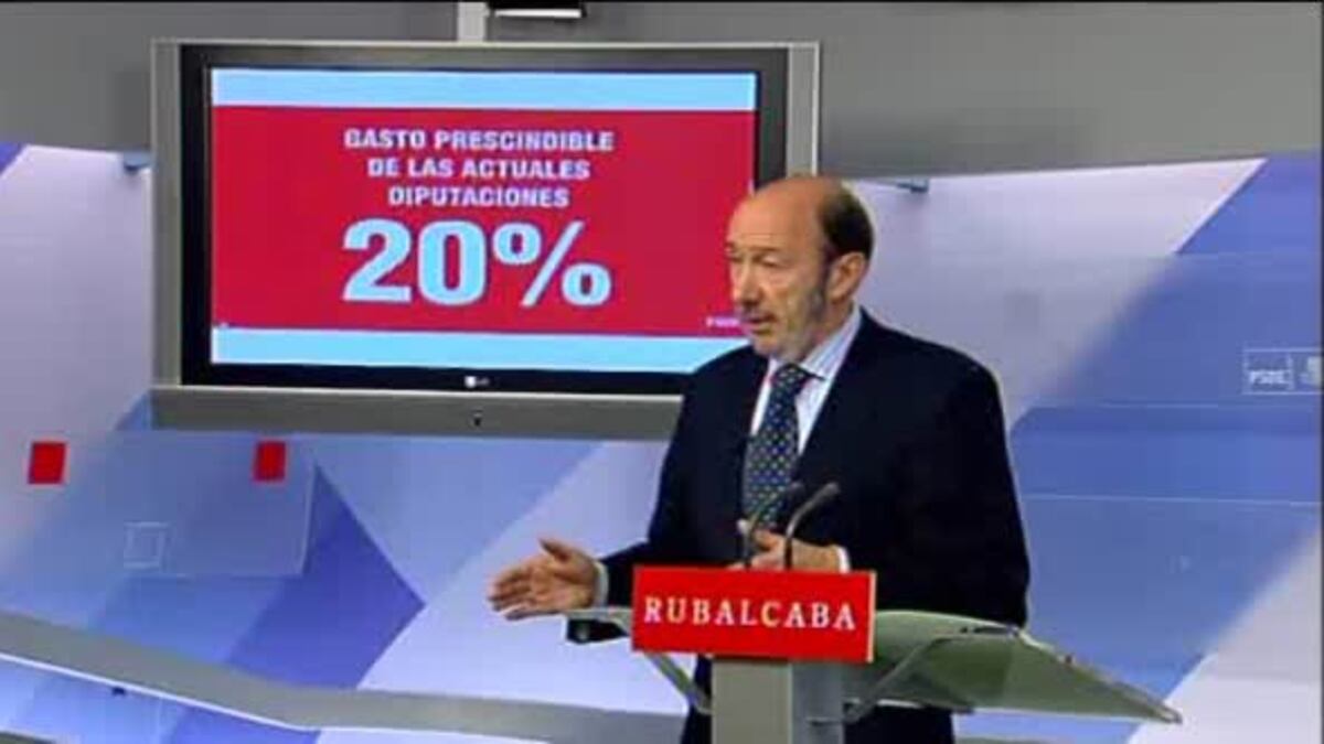 El ahorro en las instituciones es uno focos en los que se ha centrado el debate de Rubalcaba desde que fuera nombrado aspirante a La Moncloa: la rebaja del gasto que suponen las 38 Diputaciones Provinciales sería un total de "1.000 millones de euros y 1.000 cargos políticos”, como el propio Rubalcaba admitió en un encuentro la semana pasada con simpatizantes en Vigo.