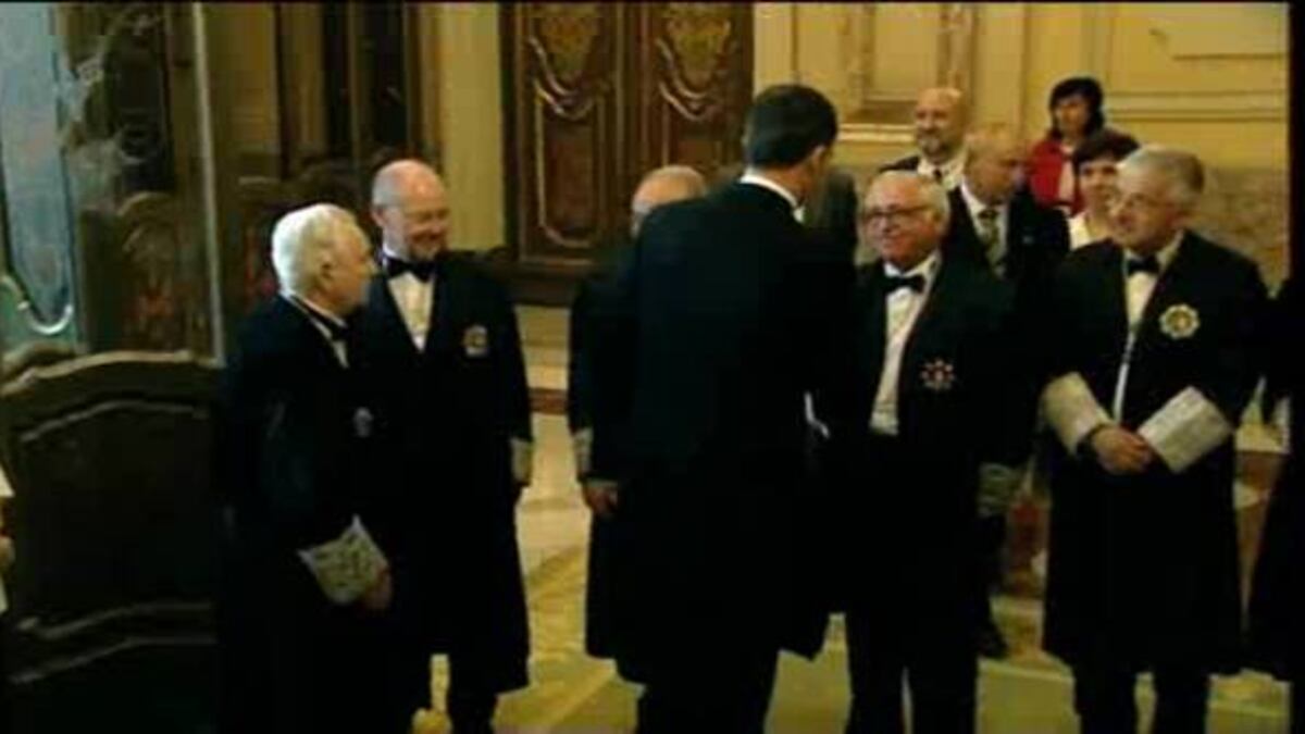Tampoco se vio cómodo al Príncipe, investido con toga, Toisón de oro y el Gran Collar de la Justicia que utiliza el Rey cuando preside actos en el Supremo. Abrevió su intervención, de apenas un folio, recibió un libro conmemorativo y desapareció un cuarto de hora después de iniciado el cóctel. Dívar bajó a acompañarle y ya no regresó al salón de plenos. La vicepresidenta Soraya Sáenz de Santamaría; el ministro de Justicia, Alberto Ruiz-Gallardón; el presidente del Tribunal Constitucional, Pascual Sala, y muchos otros aprovecharon la coyuntura y desaparecieron también. Solo el fiscal del Estado, Eduardo Torres-Dulce, permaneció en el salón departiendo con presidentes de Sala del Supremo, magistrados, fiscales y vocales del Poder judicial.