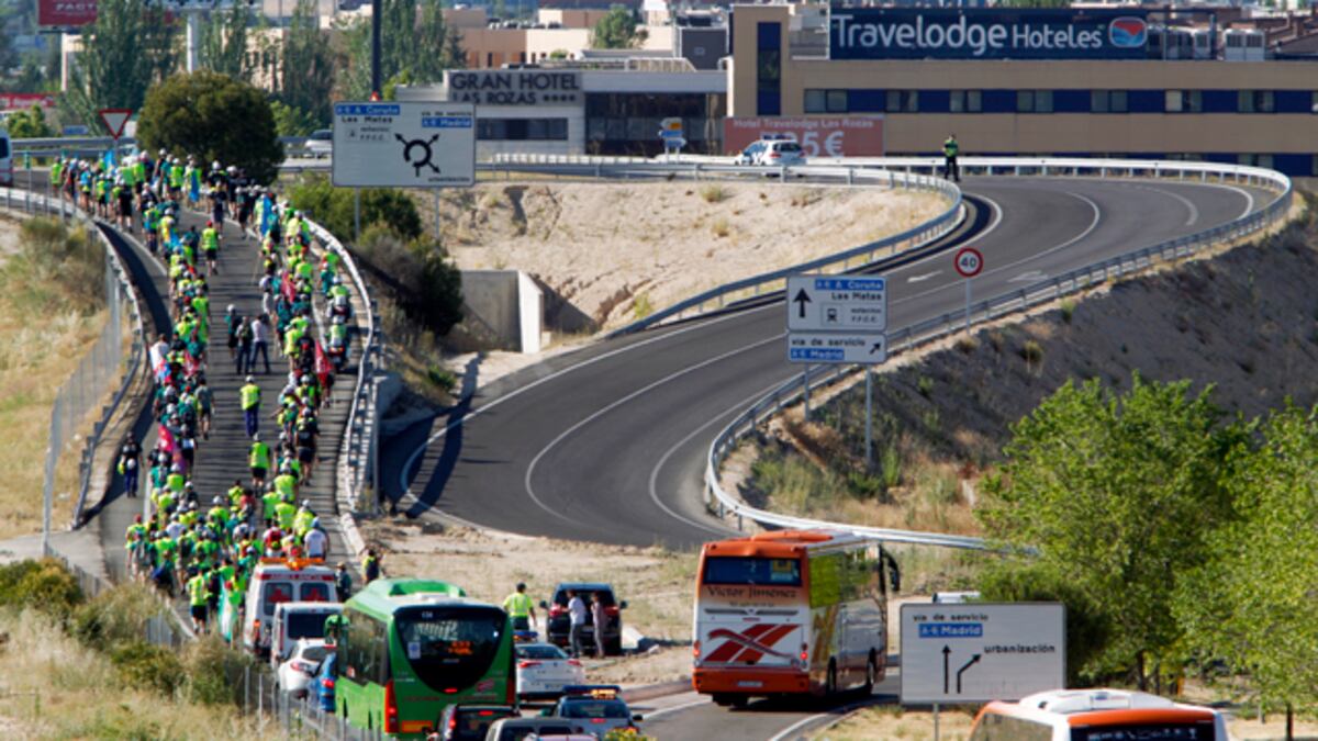 La cuenta atrás ha comenzado. La columna norte de la manifestación de mineros, procedente de Asturias, Palencia y León, ha llegado a primera hora de la tarde a Aravaca, barrio situado en el oeste de Madrid. Los vecinos los han recibido con aplausos y han dispuesto lo necesario para que los caminantes puedan descansar y comer. La otra marcha, que partió de Aragón, también ha alcanzado su destino en el municipio madrileño de Alcobendas, al norte de la capital. Los mineros han recorrido más de 400 kilómetros, han aguantando el calor y el cansancio acumulado para transmitir al ministro de Industria, José Manuel Soria, el malestar por el recorte del 63% de las subvenciones para este año que, según denuncian los manifestantes, provocará el cierre de las minas de carbón en Asturias, León, el norte de Palencia, Aragón y Castilla-La Mancha.