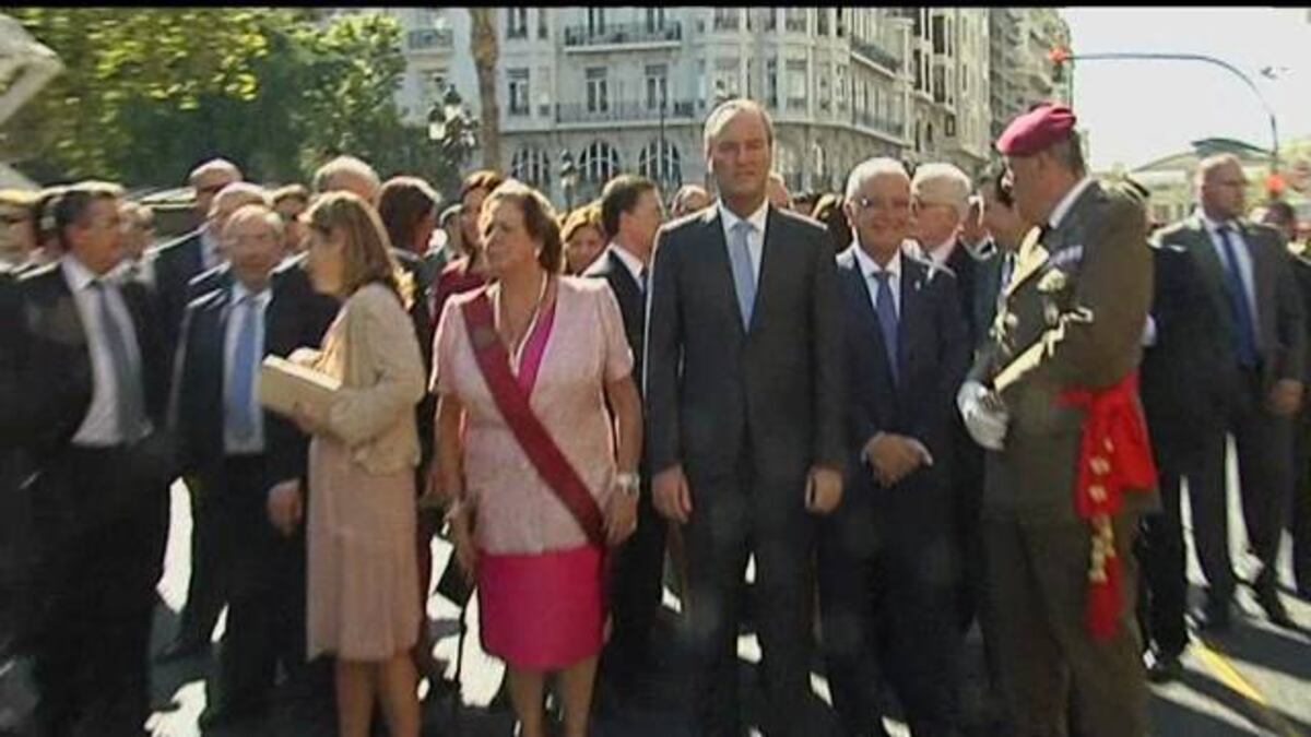 El presidente de la Generalitat Valenciana, Alberto Fabra, junto a otros diputados de las Cortes de la Comunidad y la alcaldesa de Valencia, Rita barberá, han sido recibidos hoy entre insultos y abucheos durante el acto oficial y la procesión cívica que se celebraban como parte del Día de la Comunidad valenciana. Numerosos manifestantes criticaron la política de recortes que se está aplicando y varios miembros de la Radiotelevisión Valenciana (RTVV) que hoy se encontraban en huelga protestaron por el nuevo expediente de regulación de empleo que afecta directamente a multitud de sus trabajadores.
