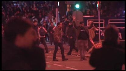 La policía ha dispersado con salvas y botes de humo a grupos que lanzaban piedras y botellas Contenedores y mobiliario urbano de todo tipo ha ardido en el paseo del Prado y Atocha Los alborotadores, aparentemente coordinados, han atacado a su paso dos sucursales bancarias, un concesionario de coches, una cadena de comida rápida y un supermercado