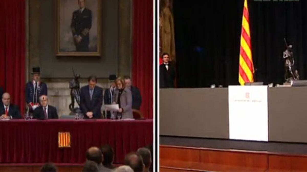 Artur Mas ha tomado posesión hoy como presidente de la Generalitat. Se impone como misión un cambio en el rumbo de la historia de Cataluña, aunque reconoce que no se puede hacer de golpe. Ha repetido la misma fórmula que hace dos años, prometiendo la Constitución, pero en aquella ocasión lo hacía con el retrato del Rey tras él, y a su derecha se encontraba Manuel Chaves, ministro de Administraciones Públicas. En esta ocasión el retrato de don Juan Carlos ha quedado oculto bajo un telón negro y al ministro Cristóbal Montoro le han ubicado entre el público.