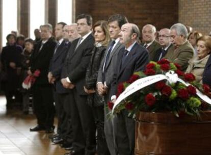 El secretario general del PSOE, Alfredo Pérez Rubalcaba, llegó acompañado de la vicesecretaria general del partido, Elena Valenciano, momentos antes de que los restos mortales del exministro socialista fueran introducidos en el templo. "Fue un gran ministro y un gran socialista al que le vamos a echar muchísimo de menos" fueron las palabras que Rubalcaba dedicó a Martínez Noval, de quien Elena Valenciano dijo también que fue "un referente como parlamentario, dirigente y compañero".