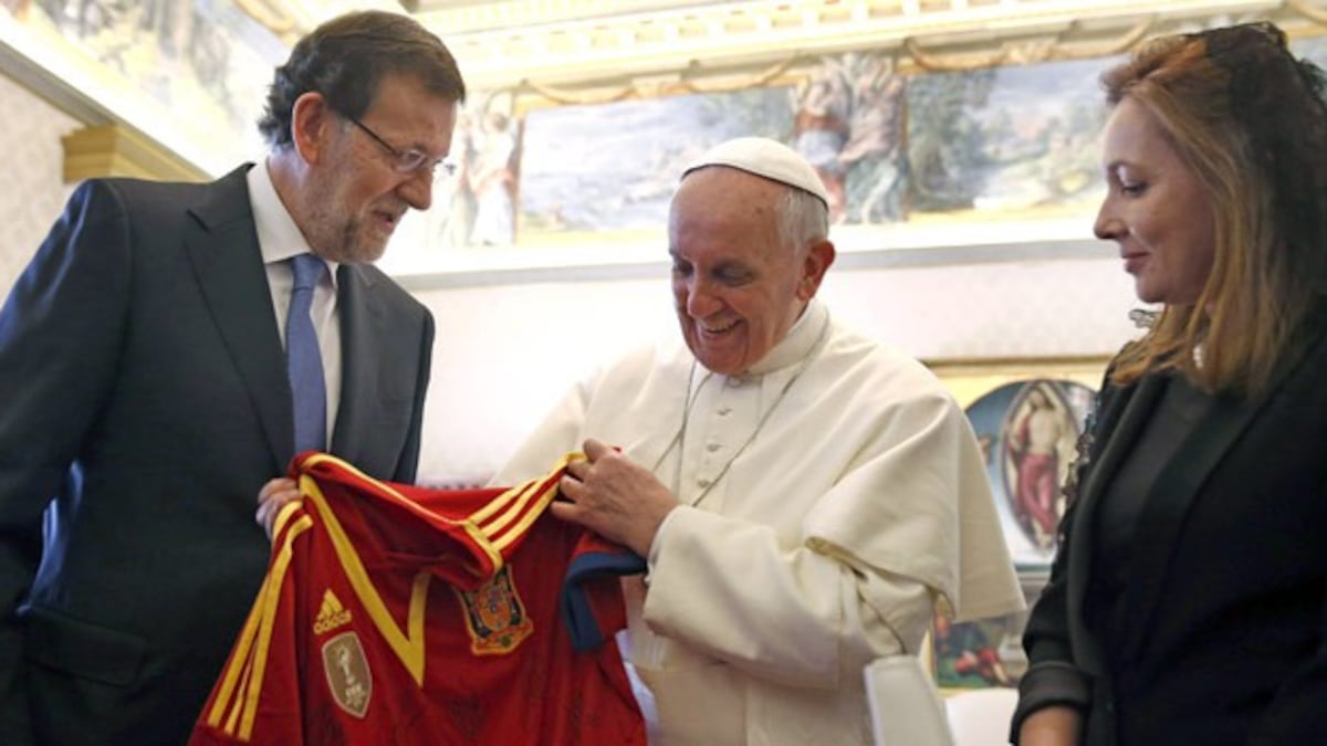 Así que la información de La Moncloa se limitó prácticamente a comentar las imágenes del encuentro. Tras los minutos de conversación a solas, el papa Francisco saludó al séquito de Rajoy, compuesto por nueve personas, entre las que se encontraba su esposa, Elvira Fernández, ataviada con mantilla española. Rajoy entregó al Papa un facsímil del libro De Aetatibus Mundi Imagines, del 1500, obra de Francisco de Holanda, y una camiseta de la selección española firmada por los jugadores. Jorge Mario Bergoglio regaló al presidente una pluma de los Museos del Vaticano y el preceptivo rosario para los miembros de la delegación –dentro de una funda en la que todavía figura el escudo del Papa anterior--. Hubo que esperar a la nota de prensa de la Santa Sede para tener constatación oficial del contenido de la reunión.