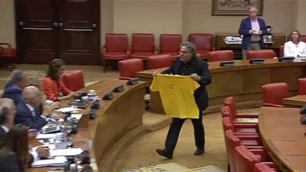 El portavoz de ERC en el Congreso de los Diputados, Joan Tardá, ha entregado en el Congreso al ministro de Exteriores, José Manuel García-Margallo, la camiseta que, según el independentista, "se pondrán casi quinientas mil personas" el día de la Diada, le ha dicho al titular de Exteriores justo antes de que comenzara la comparecencia sobre el conflicto de Gibraltar.