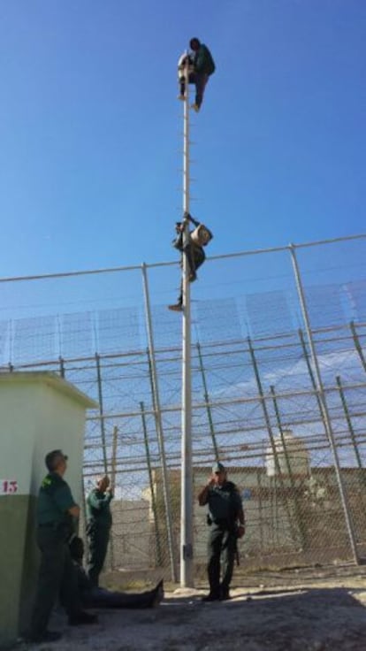 Dos inmigrantes se suben dos horas a un poste tras saltar la valla de Melilla