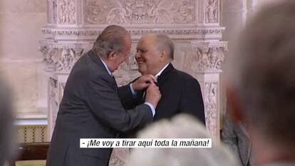 A don Juan Carlos, que se deshizo en halagos a Iglesias -"un hombre capaz e íntegro"; "aúna rigor, la excelencia, el conocimiento, el espíritu conciliador, la sensibilidad diplomática y el don de gentes", ha dicho-,  le ha costado imponer la insignia de caballero de la orden del Toisón de oro al exsecretario general de Iberoamérica, ya que le resistía el ojal cerrado de la solapa. "Te voy a tener aquí toda la mañana", ha bromeado el Monarca.