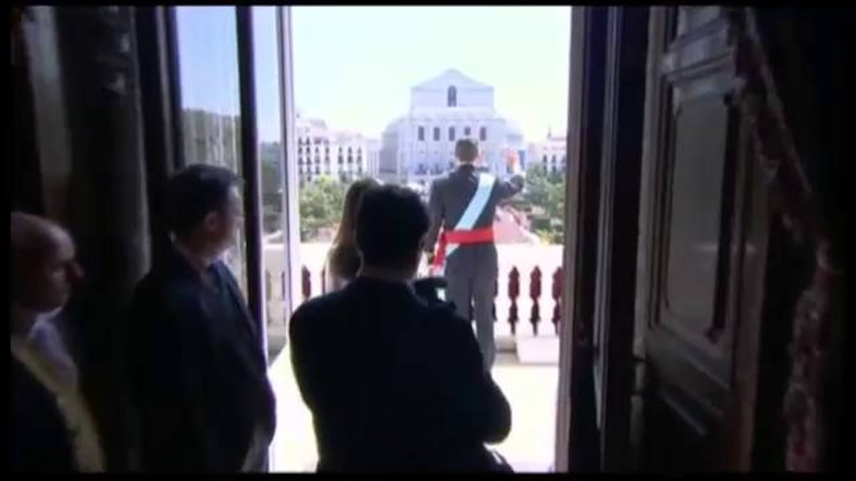 Felipe VI, doña Letizia, la Princesa de Asturias, la infanta Sofía, don Juan Carlos I y doña Sofía saludan juntos desde el balcón del Palacio Real