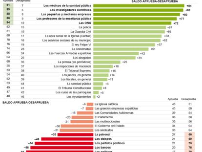 Los pilares básicos que han sostenido a la sociedad a lo largo de estos años de dificultades (principalmente económicas) siguen recibiendo la aprobación mayoritaria —y más amplia que la del año pasado— de la ciudadanía. Sobre todo los médicos de la sanidad pública, que pasan a liderar la clasificación, superando por poco a los investigadores científicos (única institución que no incrementa su saldo en comparación con la oleada anterior: un hecho entendible si se tiene en cuenta que partían de un saldo muy elevado y susceptiblemente mucho más difícil de mejorar). La tercera plaza pasa a ser ocupada ahora —superando a los profesores de la enseñanza pública— por las pequeñas y medianas empresas cuyo saldo mejora en más de 30 puntos. Este ascenso de las PYMES —llamativo y significativo— obedece probablemente a un reconocimiento ciudadano a su labor. Hay que tener en cuenta que estas suponen más del 99% del tejido empresarial español y son las que, probablemente, están teniendo mayores dificultades para soportar y resistir la crisis económica.