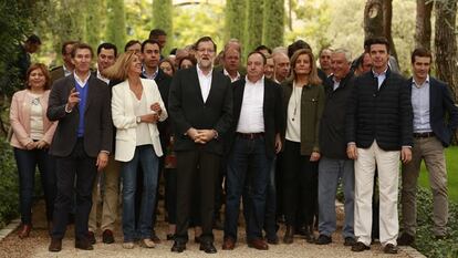 El resto del mitin de la unidad, la cita en un cigarral de Toledo de todos los ministros, presidentes autonómicos, diputados y senadores miembros de la Junta Directiva Nacional, se compuso sobre todo para hacerse una foto de equipo, de familia, alrededor del líder. La imagen se tomó, aunque algunos de los presentes evitaron los codazos para aparecer en las primeras filas. Luego Rajoy hizo su habitual balance de logros, anticipó que 2015 terminará con 650.000 empleos más, y presumió de haber protegido el Estado del bienestar en los peores momentos de la crisis.