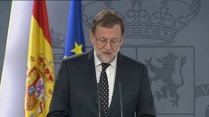 Rajoy compareció anoche de urgencia en La Moncloa, tras escuchar el discurso del nuevo candidato a la presidencia de la Generalitat de Cataluña, Carles Puigdemont, para realizar una declaración institucional en la que reafirmó que no permitirá ninguna ilegalidad ni que se rebase la Constitución. Tras hablar por teléfono con Pedro Sánchez y Albert Rivera, Rajoy incidió sobre todo en que el programa separatista expuesto en el Parlamento catalán ahora por Puigdemont es igual al que expuso hace dos meses, el pasado 9 de noviembre, en la misma sede parlamentaria el anterior presidente catalán, Artur Mas, y que luego el Tribunal Constitucional anuló en su integridad por ilegal y que “ha dejado sin efecto”.
