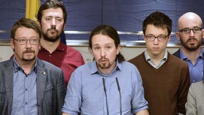Iglesias ha comparecido en el Congreso, como ya ha hecho en otras ocasiones, rodeado de su núcleo duro y representantes de las alianzas en Cataluña y Galicia: En Comú Podem y En Marea. El dirigente ha analizado esta mañana con la Ejecutiva y el grupo parlamentario la reunión a tres bandas. ¿Por qué ha precipitado esta decisión en lugar de esperar una respuesta del PSOE al documento con 20 "cesiones" que le entregó el jueves? Porque, en opinión de Iglesias, no hay margen para ningún acuerdo.