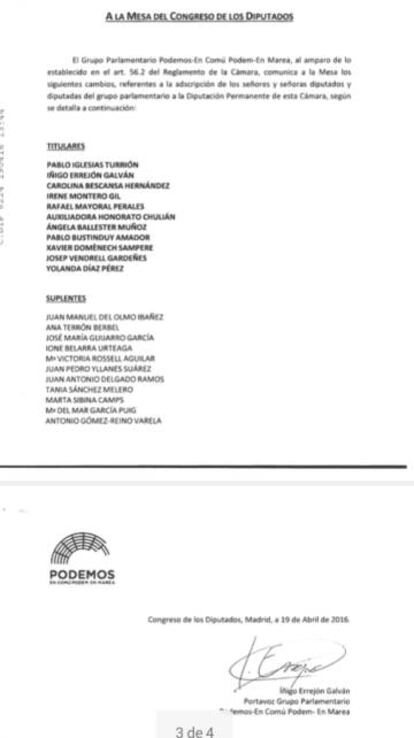 Los miembros de Podemos en la Comisión Permanente del Congreso, si no hay nuevas modificaciones, están decididos. Entre los titulares figuran el núcleo más próximos a Iglesias y algunos diputados considerados más afines a Errejón. La lista incluye a dos representantes de En Comú Podem y a uno de En Marea, aunque no su portavoz actual, Alexandra Fernández. Se trata de Pablo Iglesias, Íñigo Errejón, Carolina Bescansa, Irene Montero, Rafael Mayoral, Auxiliadora Honorato, Àngela Ballester, Pablo Bustinduy, Xavier Domènech (En Comú Podem), Josep Vendrell (En Comú Podem) y Yolanda Díaz (En Marea). Entre los suplentes, además de Ana Terrón, están Juan Manuel del Olmo, los jueces Victoria Rosell y Juan Pedro Yllanes, Tania Sánchez o el gallego Antonio Gómez-Reino Varela.