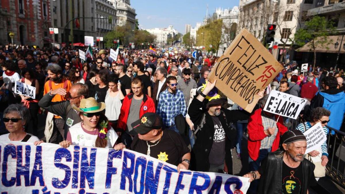El movimiento 15-M celebró este domingo en Madrid su quinto aniversario al margen de los partidos en una manifestación que terminó en la Puerta del Sol, símbolo de las movilizaciones de 2011, con una modesta afluencia. Algunos millares de personas marcharon entre el Ayuntamiento y la plaza sin cabecera oficial. Podemos no participó en el aniversario, aunque algunas cabezas visibles de la formación como el cofundador Juan Carlos Monedero sí estuvieron en la manifestación.