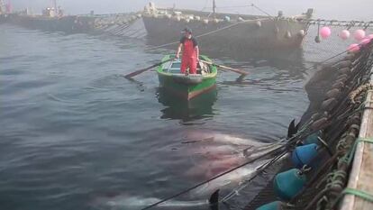 Antes, buzos como Miguel Ángel Ruiz centraban su labor en el mantenimiento de las redes y en el control de la cantidad de pescado. Ahora, acaban con la vida del animal con un tiro en la cabeza, en lugar del con el gancho que se le introducía por la cavidad ocular. “El pescado no sufre y la carne se queda mucho mejor. Con el bichero se estresaba y ahogaba y eso se notaba en la carne”, reconoce el submarinista. A fin de cuentas, como matiza el buzo de 37 años, “ellos [los japoneses] mandan, que para eso compran”.