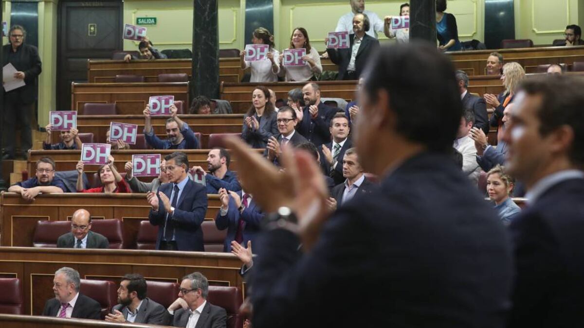 En el inicio del pleno, diputados de Podemos, con Pablo Iglesias a la cabeza, se han puesto en pie con la declaración de derechos humanos en la mano, con una enorme letra D en su portada. Curiosamente, no estaba presente el portavoz de Podemos, Íñigo Errejón, que ha entrado en el hemiciclo justo después.